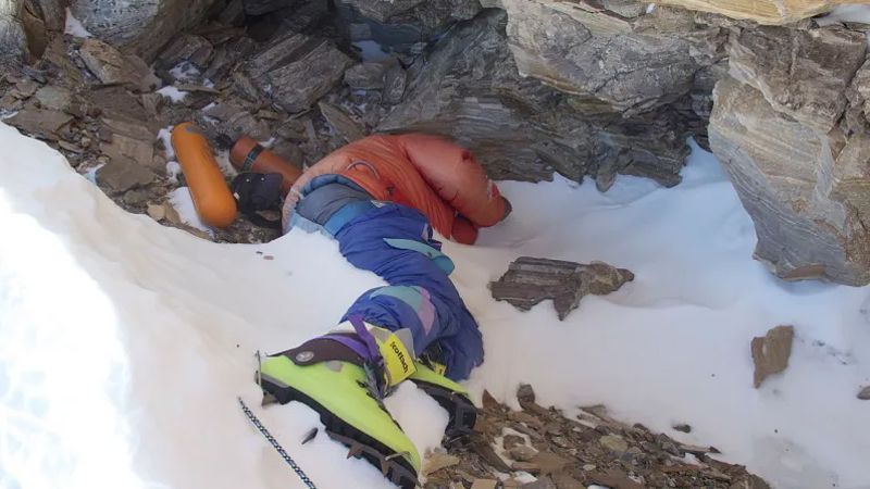 Los restos pertenecen a un escalador que falleció bajo una roca que sobresale. Sus botas verdes, aún en sus pies, miran hacia el camino que lleva a la cumbre.