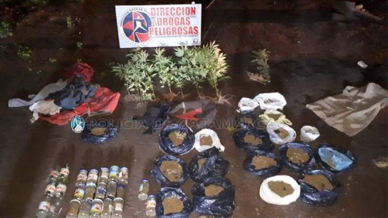 En ese mismo lugar, los policías incautaron bolsas de nylon y frascos de vidrio conteniendo unos 2,500 kg de picadura de la sustancia estupefaciente compuesta por hojas, tallos y semillas triturados, y una bomba de agua que estaba en medio de la maleza.