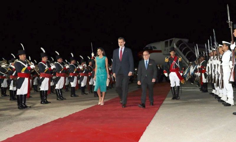 Según confirmaron testigos, el rey Felipe VI y la reina Letizia tuvieron que esperar una hora hasta que pudieron descender del avión oficial, un Airbus A-310 de la Fuerza Aérea Española, hasta que la escalera adecuada tocó la pista y les permitió descender. Debajo, sobre la pista, esperaban formados miembros del Regimiento Granaderos de San Martín, y los embajadores Ramón Puerta, y Javier Sandomingo.