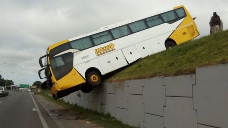Un ómnibus de larga distancia se despistó en la autopista Rosario-Santa Fe y quedó colgado de la autovía en un accidente impactante que no registró ningún herido de gravedad.