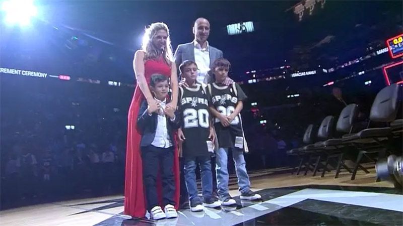 "Y a vos, Many... Tendría que durar dos tres horas el evento para agradecerte. Gracias por aguantar mis obligaciones durante 20 años, que la siesta tiene que ser a esta hora, que el silencio tiene que ser total, que la comida..., que no puedo salir porque estoy cansado y mañana juego. Gracias por bancarte todo eso y ayudarme a que todo esto sea más fácil y que solo tenga que pensar en jugar", le dijo Manu a su mujer, que lo miraba sentada junto a sus tres hijos en el centro de la cancha de los Spurs.