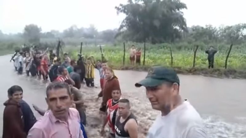 "Así está el camino a Colonia 12, Santa Ana. Los docentes estamos pasando gracias a la ayuda de los padres. Nunca más esto, ¿no?", se escucha relatar a una voz en un video que muestra cómo armaron una especie de "cordón humano" para que el agua no arrastre a nadie.
