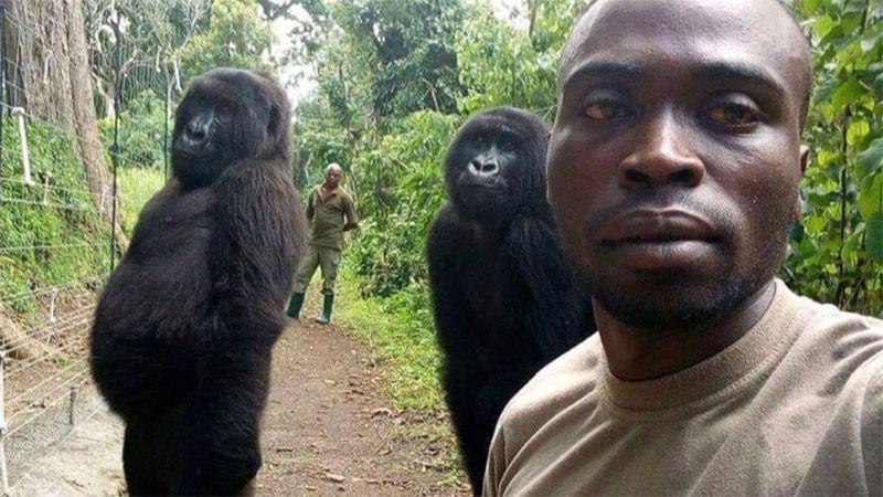 Un par de gorilas de montaña posaron como si fueran humanos para una selfie con un guardabosques en el Parque Nacional de Virunga, en el este de la República Democrática del Congo, y la fotografía se hizo viral en redes sociales.