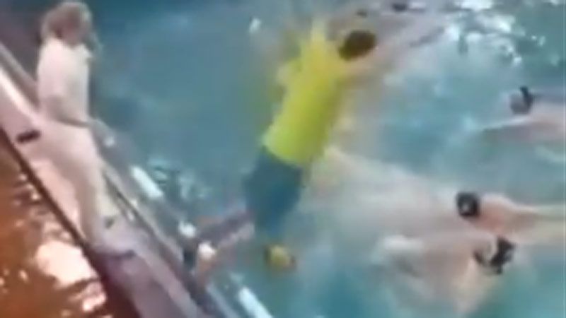El entrenador no dudó en saltar con los pies por delante desde el borde de la piscina hacia el que le había dado el segundo pelotazo, para a continuación agarrarse a golpes entre ellos.