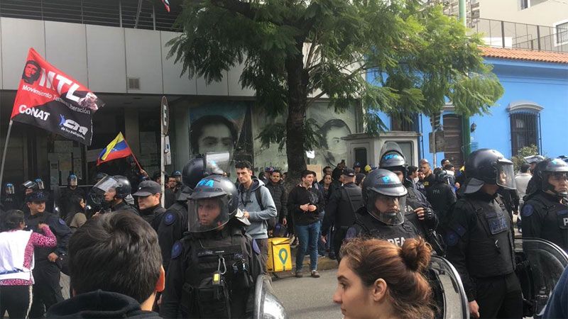 Fuerzas de seguridad custodiban esta tarde la embajada adonde llegaron para separar a ambos grupos de manifestantes.