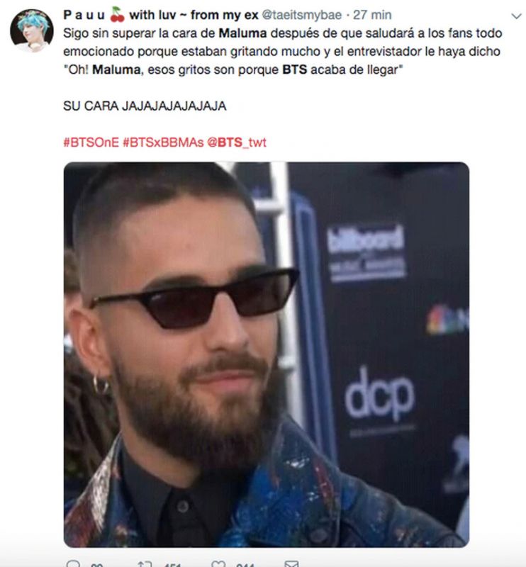 Por otro lado, BTS no solo opacó a Maluma, sino a todos en la alfombra roja al recibir el premio Top Social Artist, gracias al impresionante apoyo de sus fans.