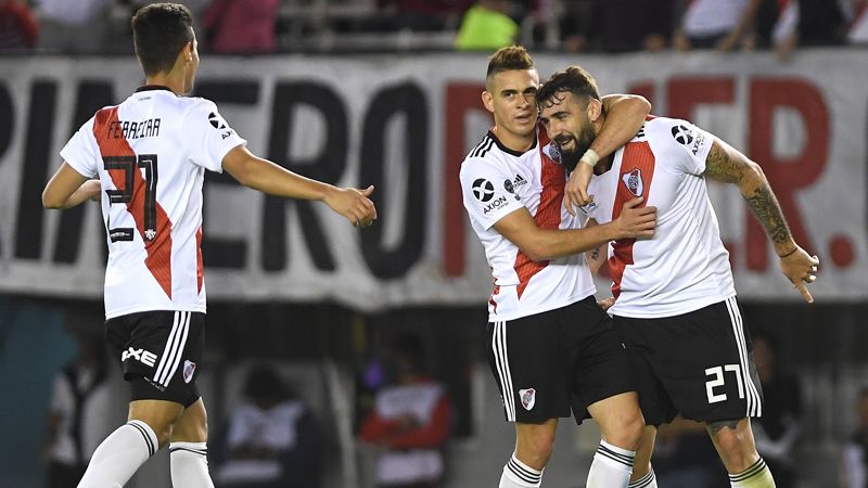 Después de un cabezazo al palo derecho de Enzo Pérez y de un latigazo dal otro poste de Fabrizio Angileri, el volante uruguayo firmó su primer doblete en el club tras una inteligente cesión dentro del área de Borré.