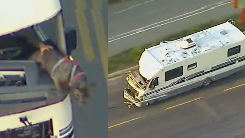 El perro que saltó por la ventana no resultó lastimado y huyó por la ladera de la carretera. el otro can que iba en la casa rodante también intentó escapar, pero la conductora se aferró a él.