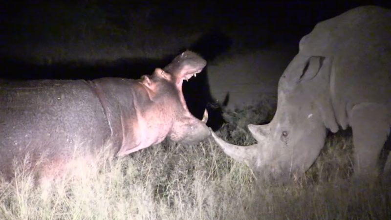 En las imágenes se puede ver como un hipopótamo desafía a un rinoceronte mostrándole persistentemente los dientes y olfateándolo, hasta que el cornudo animal se cansa de las provocaciones y sin aparente ánimo de ataque pincha ligeramente al hipopótamo y se retira de la escena. Lejos de sentirse disuadido, el hipopótamo finalmente logra captar la atención del rinoceronte, quien esta vez arremete con su cuerno.