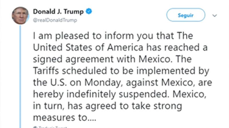 "Me complace informar que los Estados Unidos de América han alcanzado un acuerdo con México. Las tarifas programadas para ser implementadas por los EEUU el lunes, en contra de México, quedan suspendidas indefinidamente. México, a su vez, ha acordado tomar medidas enérgicas para… detener la marea de la migración a través de México y hacia nuestra frontera sur. Esto se está haciendo para reducir o eliminar en gran medida la inmigración ilegal que viene de México a los Estados Unidos. Los detalles del acuerdo serán publicados en breve por el Departamento de Estado. ¡Gracias!", publicó el mandatario estadounidense en su red social.