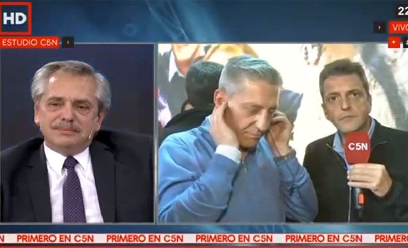 El candidato a Presidente del kirchnerismo, Alberto Fernández, estaba brindando un reportaje en el canal C5N cuando un móvil en vivo desde la provincia de Chubut le permitió saludar al líder del Frente Renovador. El ex intendente de Tigre había viajado al sur para festejar junto a Mariano Arcioni, que esta tarde obtuvo la reelección.