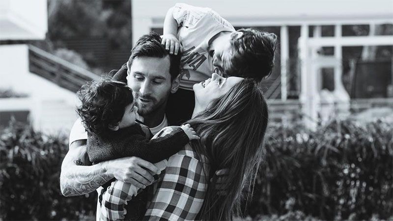 Y agregó cinco fotos. Una de los cinco integrantes de la familia abrazándose; otra de Leo con Mateo, ambas en blanco y negro; una de los cinco en el avión privado; otra de Messi con Mateo y Thiago; y una última con los tres chicos en una tribuna.