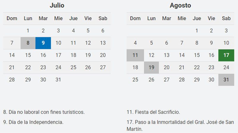 Según el calendario oficial, el 9 de julio es feriado. Pero el lunes 8 será día no-laboral con fines turísticos, lo que en algunas ocasiones se conoce como "feriado puente". De ahí la confusión acerca de si los trabajadores dispondrán o no de fin de semana extra largo.