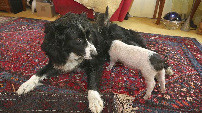 La chanchita se llama "Rosa von Schwarte". Gruñe y se recuesta debajo de la Border Collie de pelaje negro y blanco bautizada como Molly. Con la trompa, Rosa busca su tetilla, justo para empezar a tomar leche, mientras la "madre adoptiva" mueve la cola.