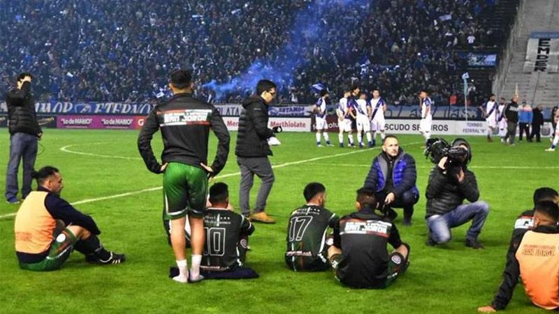 Los primeros responsabilizan al árbitro de no haber llamado a reanudar el cotejo luego de una “sentada” de los jugadores visitantes, que la decisión de sentarse en el campo de juego fue conversada y consensuada en el vestuario durante el entretiempo del partido por allegados, dirigentes, cuerpo técnico y jugadores.
