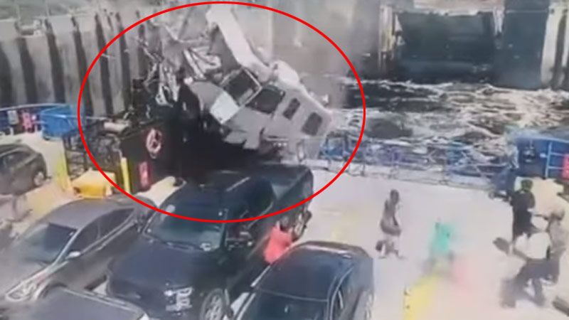 En las imágenes captadas por una cámara de seguridad se aprecia el momento en que el vehículo salta por la rampa a modo de trampolín y vuela varios metros de distancia hasta aterrizar en la cubierta de la embarcación, por poco aplastando a otras personas presentes.