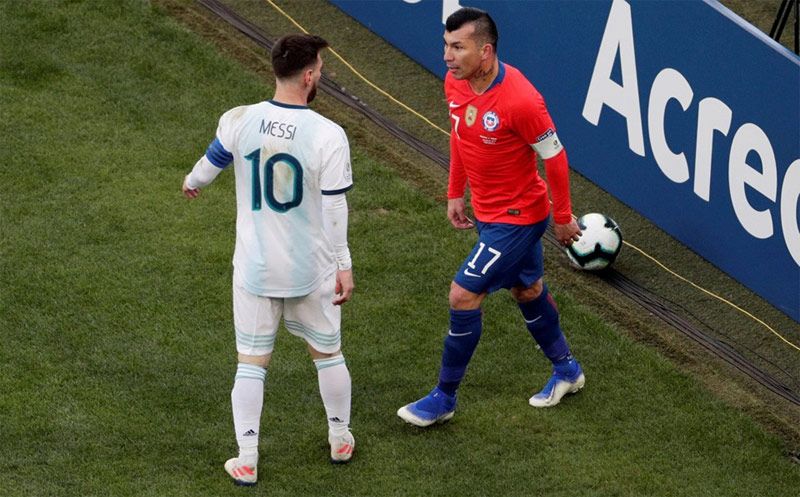 El tercer puesto de la Copa América entre Argentina y Chile se vivió en medio de un clima caliente, como si fuera una nueva final entre ellos, y los jugadores se sacaron chispas en cada cruce. Y en el más caliente, Lionel Messi y Gary Medel quedaron cara a cara, se pecharon fuertemente y el árbitro Mario Díaz de Vivar les mostró la roja a los dos en una polémica decisión.