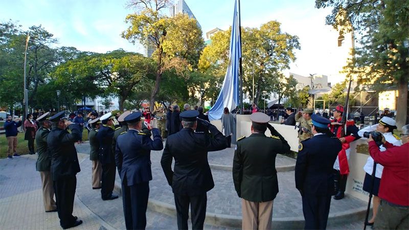 La intendente de la ciudad Capital, Norma Fuentes, y otros funcionarios municipales y provinciales fueron parte del izamiento de la bandera, entonación del Himno Nacional Argentino y de la colocación de ofrendas florales.