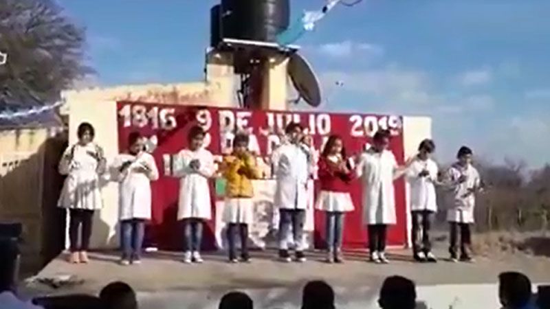 Un grupo de alumnos interpretó las estrofas del Himno durante el acto en conmemoración de la Independencia Argentina en la escuela rural "Shunko" de la localidad de La Paulina en el departamento Taboada, al sudoeste de la provincia de Santiago del Estero.