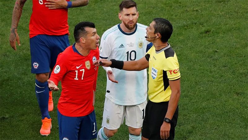 Messi fue expulsado por segunda ocasión en un choque contra Gary Medel, en donde el chileno y el argentino se pecharon. Durante el altercado, el árbitro paraguayo Mario Díaz de Vivar decidió expulsar a ambos sin revisarlo en el VAR.