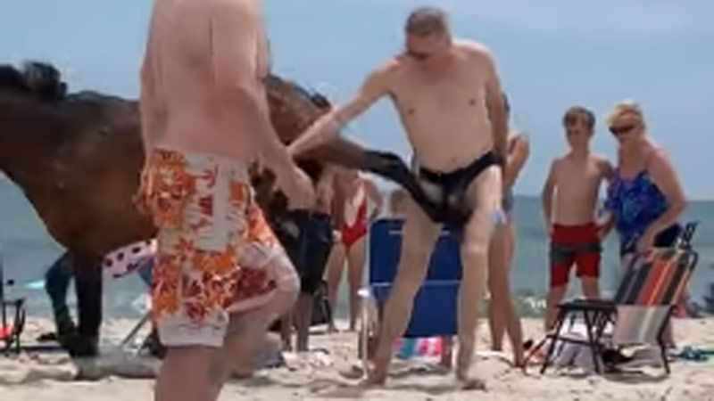 Un video grabado el pasado 18 de junio en una popular playa de la isla de Assateague, entre los estados de Maryland y Virginia (EE.UU.), puede verse cómo un caballo salvaje da una fuerte coz en la ingle a un turista en bañador.