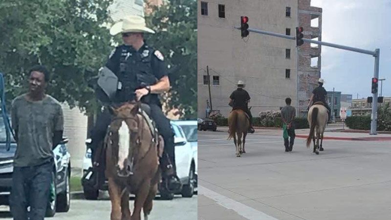 We have verified with law enforcement officials in Galveston, that the photograph taken in Galveston is real. It is hard to understand why these officers felt this young man required a leash, as he was handcuffed and walking between two mounted officers. pic.twitter.com/bEFZnn4qmH