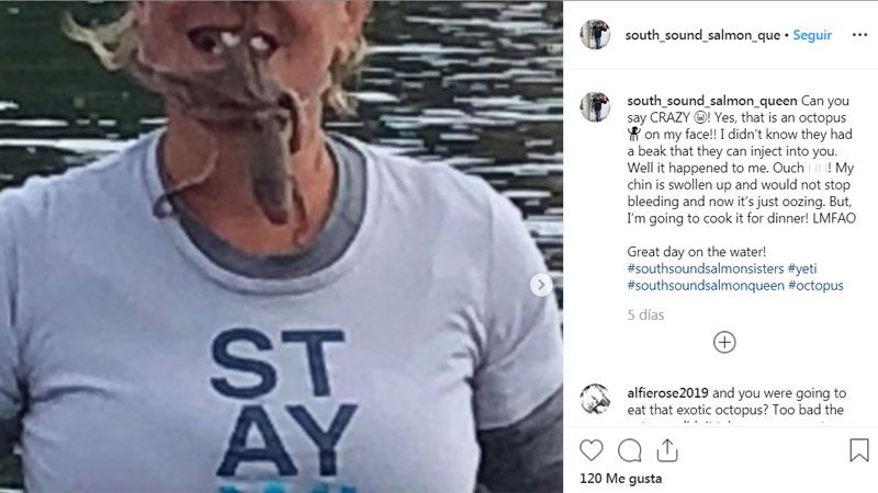 "¿Pueden decirme loca? Sí, es un pulpo en mi cara. No sabía que tenían un pico para inyectarte. Bueno, me pasó a mí. ¡Ouch! Mi mentón está hinchado y no paraba de sangrar. Ahora solo está supurando. ¡Pero voy a cocinarlo para la cena!", escribió Bisceglia en su cuenta de Instagram al compartir las fotografías previas al ataque.