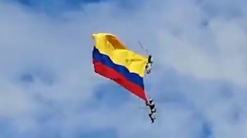 En el desfile, Mosquera y Gamboa pendían de una cuerda sujeta a un helicóptero y sostenían una bandera colombiana, mientras que otros dos efectivos llevaban el estandarte de Antioquia suspendidos de otra aeronave.