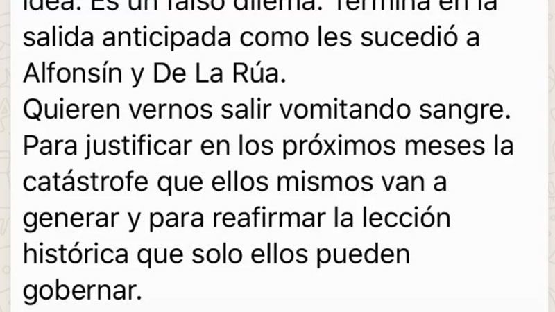Van a buscar canjearnos gobernabilidad por rendición. Ninguna concesión a esa idea. Es un falso dilema. Termina en la salida anticipada, como les sucedió a Alfonsín y De La Rúa.