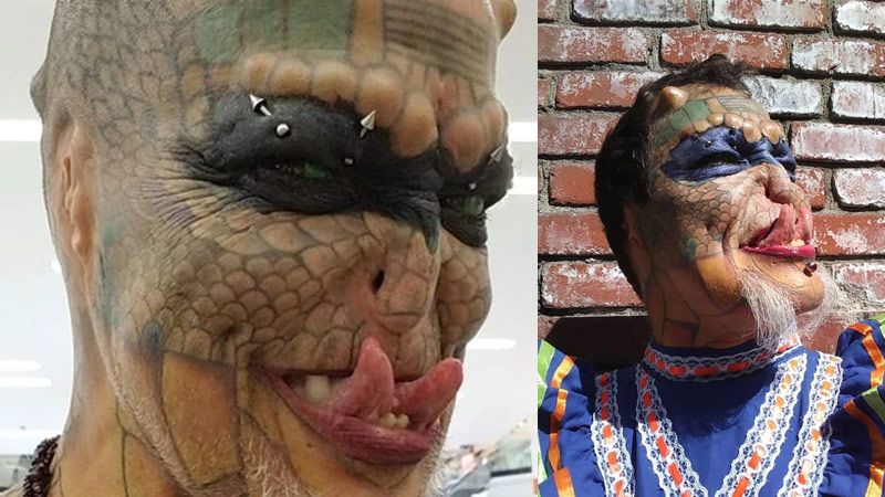 En estas dos décadas, se ha intervenido quirúrgicamente, nada más tiene seis dientes y los demás se los afiló en punto. Sus ojos fueron teñidos de verde y se dividió la lengua para imitar a una serpiente.