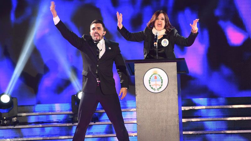 Pasada de rosca, la actriz fue y vino por la pista, vociferando y copiando algunos mohines de la expresidenta, hasta que llegó un atril y se despachó: "Qué lindo es verme, cómo extrañaban las cadenas nacionales que todas las noches todos podían escuchar, y darse cuenta lo que es tener una mujer que nos defienda y que no nos diga váyanse a dormir".
