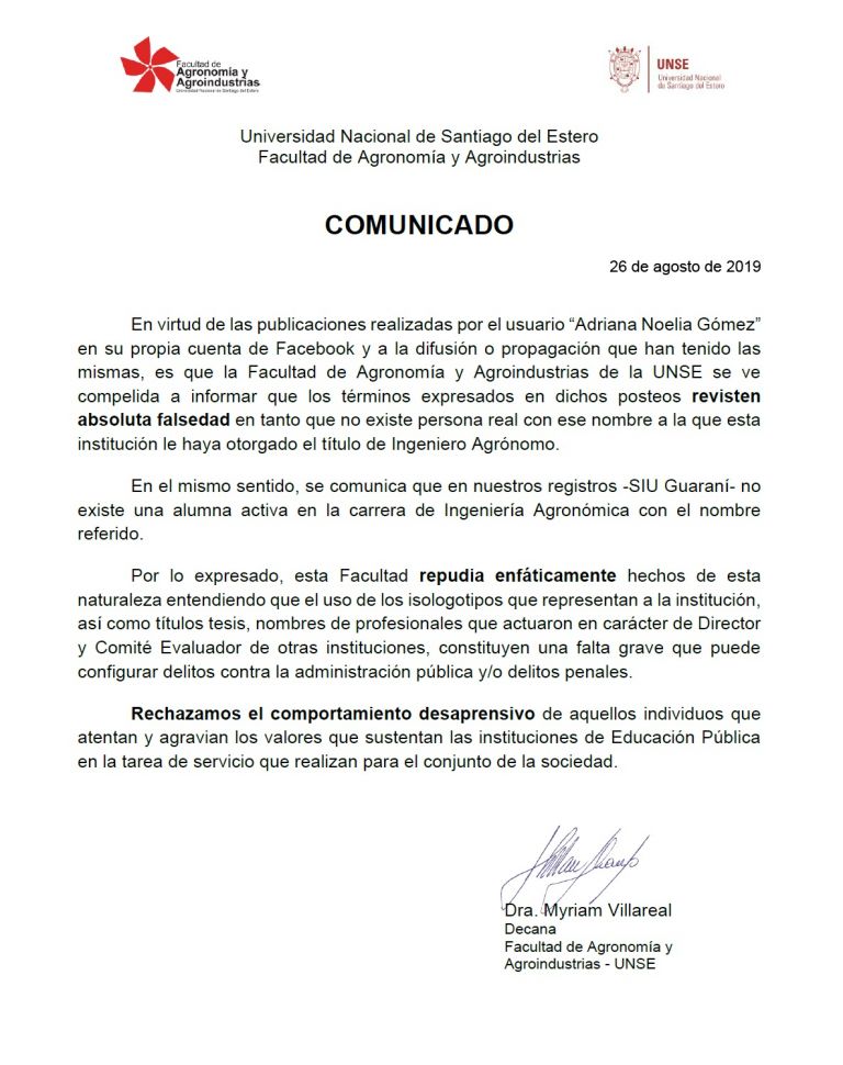 "La Facultad de Agronomía y Agroindustrias de la UNSE se ve compelida a informaron que los términos expresados en dichos posteos revisten absoluta falsedad en tanto que no existe personal real con ese nombre a la que esta institución le haya otorgado el título de Ingeniero Agrónomo", reza el comunicado que lleva la firma de la decana Myriam Villareal.