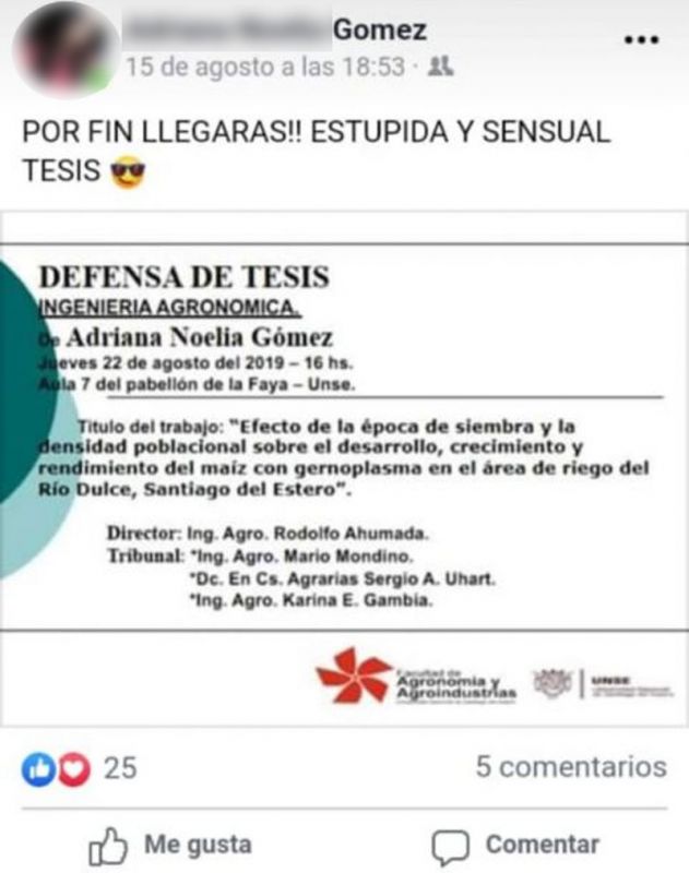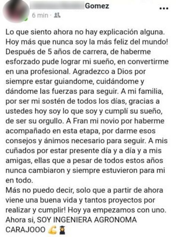 Las imágenes de la celebración junto a sentidas palabras de agradecimiento para sus familiares y amigos, fueron publicadas en el perfil de la red social Facebook por una joven de apellido Gómez. En ellas, se veía a una joven emocionada tras defender su tesis y alcanzar el título de ingeniera agrónoma.