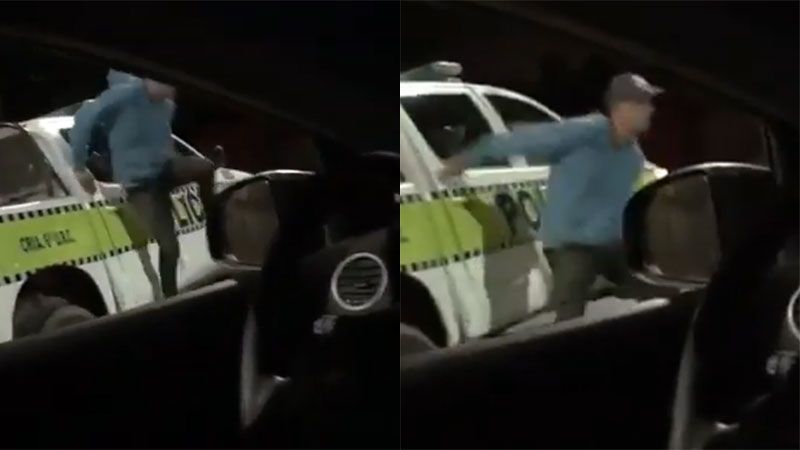 Mientras graba la escena con su celular, un movimiento inesperado lo sorprende: un joven que viste un buzo con capucha y lleva una gorra salta por la ventana del móvil policial y huye corriendo por una calle desolada.