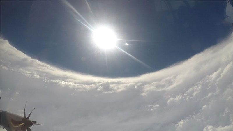 En la imagen, colgada por el meteorólogo y cazador de huracanes de la fuerza aérea Garret Black se puede ver el radiante sol en el cielo azul enmarcado en medio de la tormenta. En un rincón de la instantánea se aprecia parte de un avión de la Fuerza Aérea de los Estados Unidos.