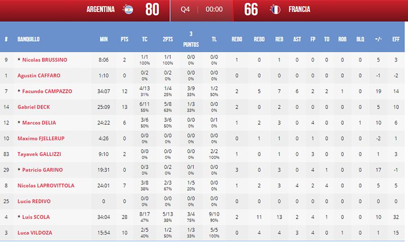 Las principales figuras del equipo argentino fueron el interno Luis Scola (28 puntos y 13 rebotes), que llegó a los 40 encuentros mundialistas y está a uno del brasileño Ubiratán Pereira Maciel, y los bases Luca Vildoza (10 unidades y 1 robo) y Facundo Campazzo (12 tantos, 7 rebotes y 6 asistencias).
