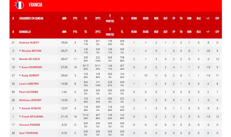 Por su lado, Francia tuvo al escolta Evan Fournier (16 unidades) y al base Frank Ntilikina (16) como principales goleadores.