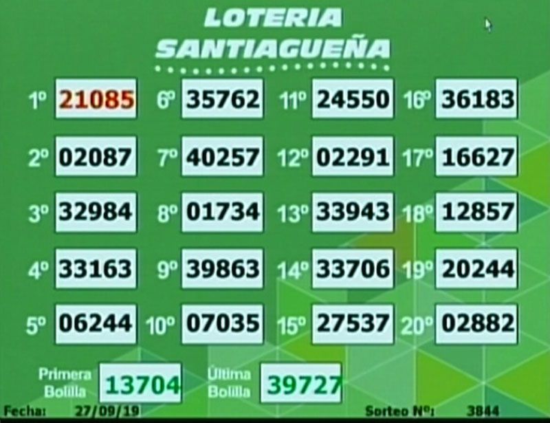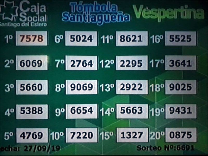 Como todos los días, este viernes 27 de septiembre se llevó a cabo un nuevo sorteo de la Tómbola Santiagueña. En la edición matutina el primer premio fue para el “5501” y en el Libro de los Sueños, el 01 es “Agua”. Más tarde, en la vespertina, en la primera ubicación salió el 7578, que en el Libro de los Sueños corresponde a "La Ramera". Por último, en el sorteo correspondiente a la Lotería Santiagueña el primer premio correspondió al 21085 y el 85 corresponde a "La linterna".