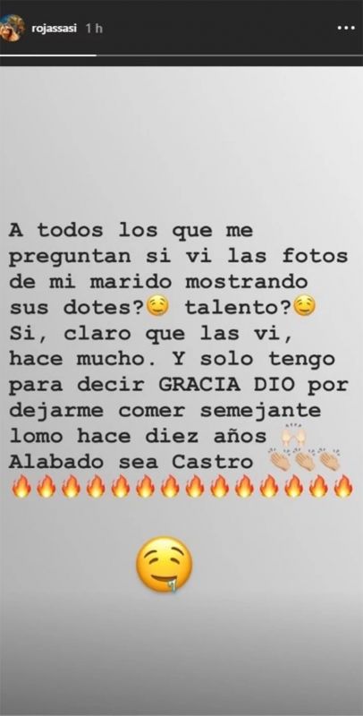 “A todos los que me preguntan si vi las fotos de mi marido mostrando sus dotes, ¿talento? Sí, claro que las vi, hace mucho. Y sólo tengo para decir ‘Gracia Dio’ por dejarme comer semejante lomo desde hace diez años. Alabado sea Castro", expresó la ex participante del Bailando.