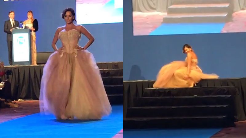 "Así fue el final del desfile ayer! Cuando cerras la pasada final y te tropezas con el vestido y el escalón de la escalera !!!! Pero que nunca se note tanto y salir adelante con una pose y sonrisa", describió el golpazo Karina.