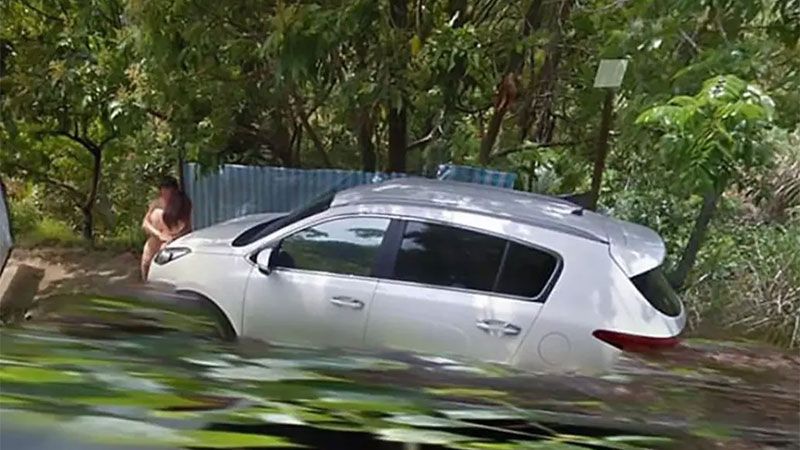 La aplicación Street View de Google Maps captó un momento íntimo de una pareja al costado de una ruta de Taiwan. En la imagen, se ve a un hombre completamente desnudo besando a una mujer, también desnuda, sobre el auto que habían estacionado al costado de la ruta camino a Shantian en Taichung.