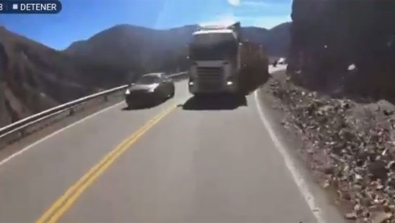 El video que circula por las redes sociales es impactante. En él se ve cómo un camión en una ruta de montaña en la Cuesta de Lipán en Jujuy, en una curva, se pasa de carril en zona prohibida y está a punto de chocar de frente con una moto.