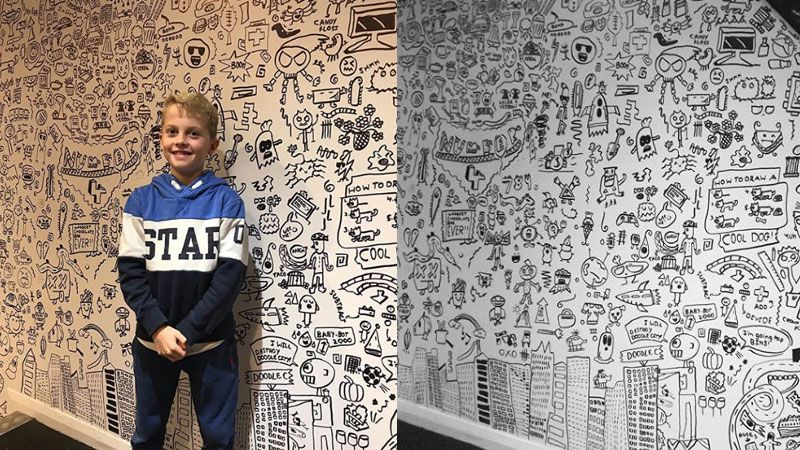 El pequeño apodado “The Doodly Boy” trabajó 12 horas decorando el local, lo cual se tradujo en más de 1,5 millones de visitas a la reproducción de su arte en las redes sociales.