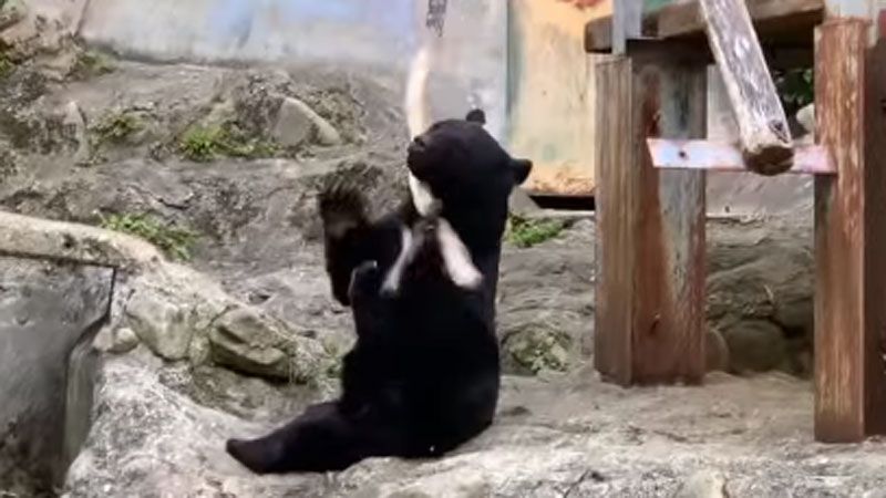 El plantígrado muestra sus habilidades para girar un palo con sus extremidades cual experimentado practicante de artes marciales.