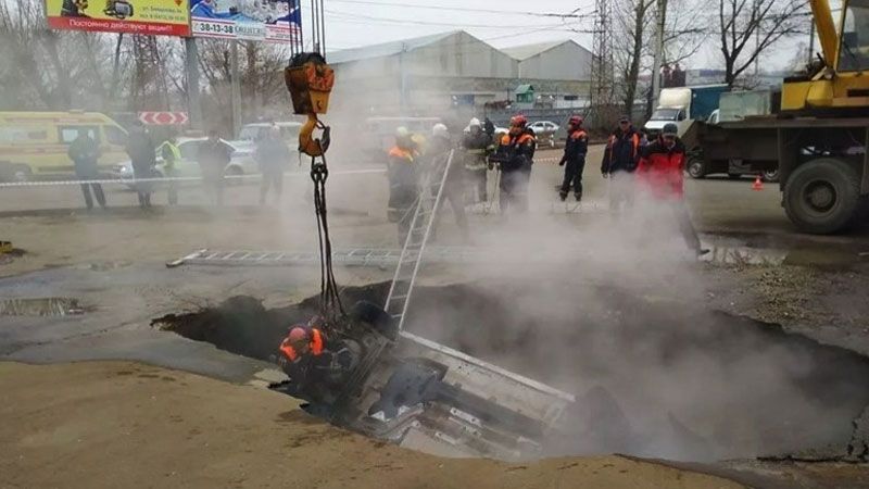 El Comité Indagatorio de Rusia ha publicado un video del momento en que un vehículo cae en un socavón con agua a altas temperaturas en la ciudad rusa de Penza.