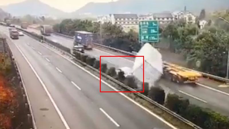 Una cámara de seguridad registró el pasado 29 de noviembre el momento en que un contenedor cayó de un camión que circulaba a gran velocidad por una autopista en las afueras de la ciudad china de Taizhou y por poco aplasta a un automóvil particular.