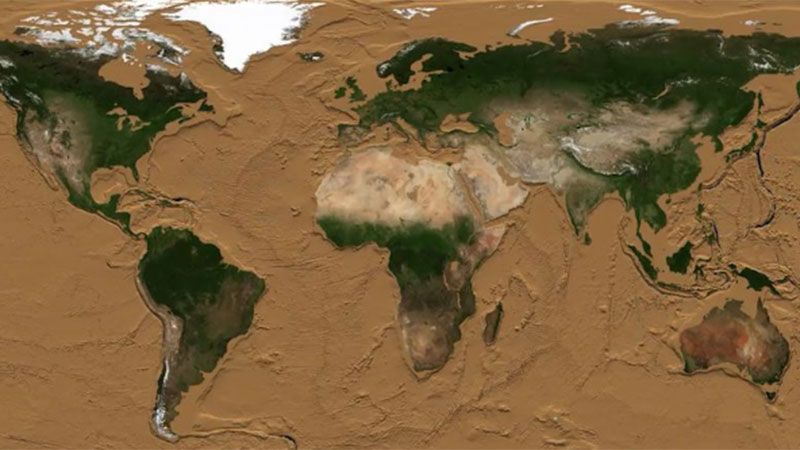 En el video de ‘timelapse’, el color marrón de la tierra seca avanza rápidamente, mientras que el azul de los mares cede a medida que las aguas descienden a más de 6.000 metros por debajo del nivel actual de las aguas.