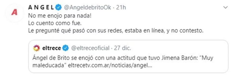 Es que Ángel compartió en su cuenta de Twitter una nota que daba cuenta de su "enojo" con la intérprete de "La Cobra" y a su lado agregó: "¡No me enojo para nada! Lo cuento cómo fue. Le pregunté qué pasó con sus redes, estaba en línea, y no contestó".