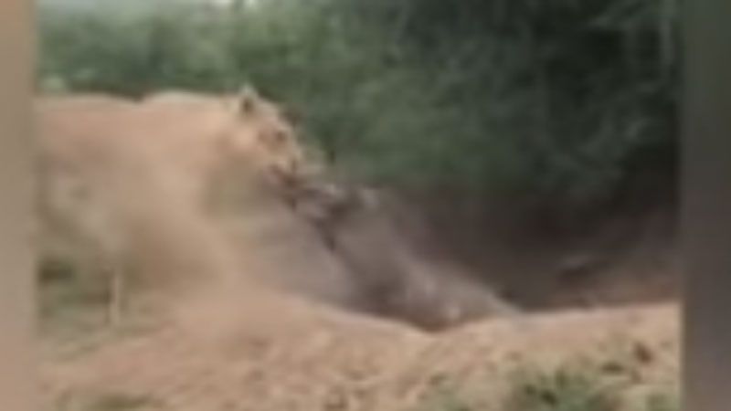 Una leona hambrienta saca a un jabalí de su madriguera en el Parque Nacional Kruger, en Sudáfrica, lucha por sobrevivir que fue grabada por un turista.