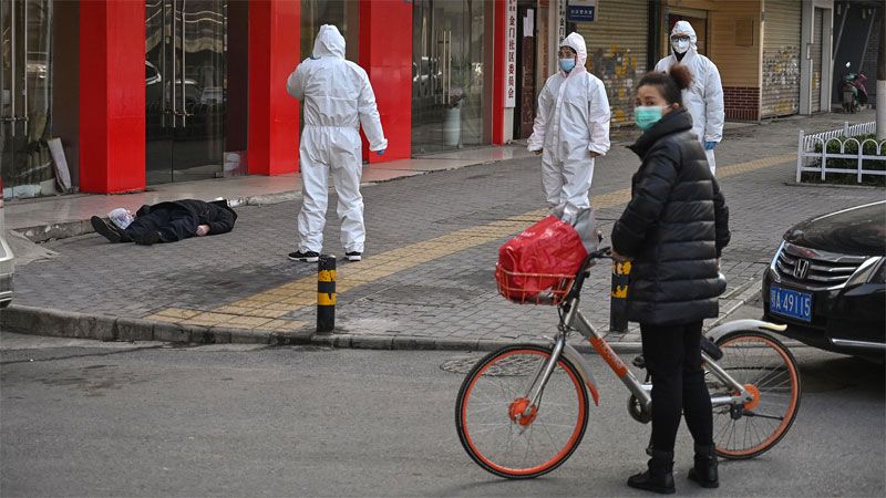 Mientras los transeúntes pasan por el lugar en bicicleta, se pudo ver a los médicos pertrechados con sus trajes blancos para evitar el contagio llegando a atender a la persona que yace frente a un edificio cerrado, como prácticamente toda la ciudad china donde más de 200 personas han muerto, miles están infectadas y 11 millones están en cuarentena. Nadie puede salir de allí.